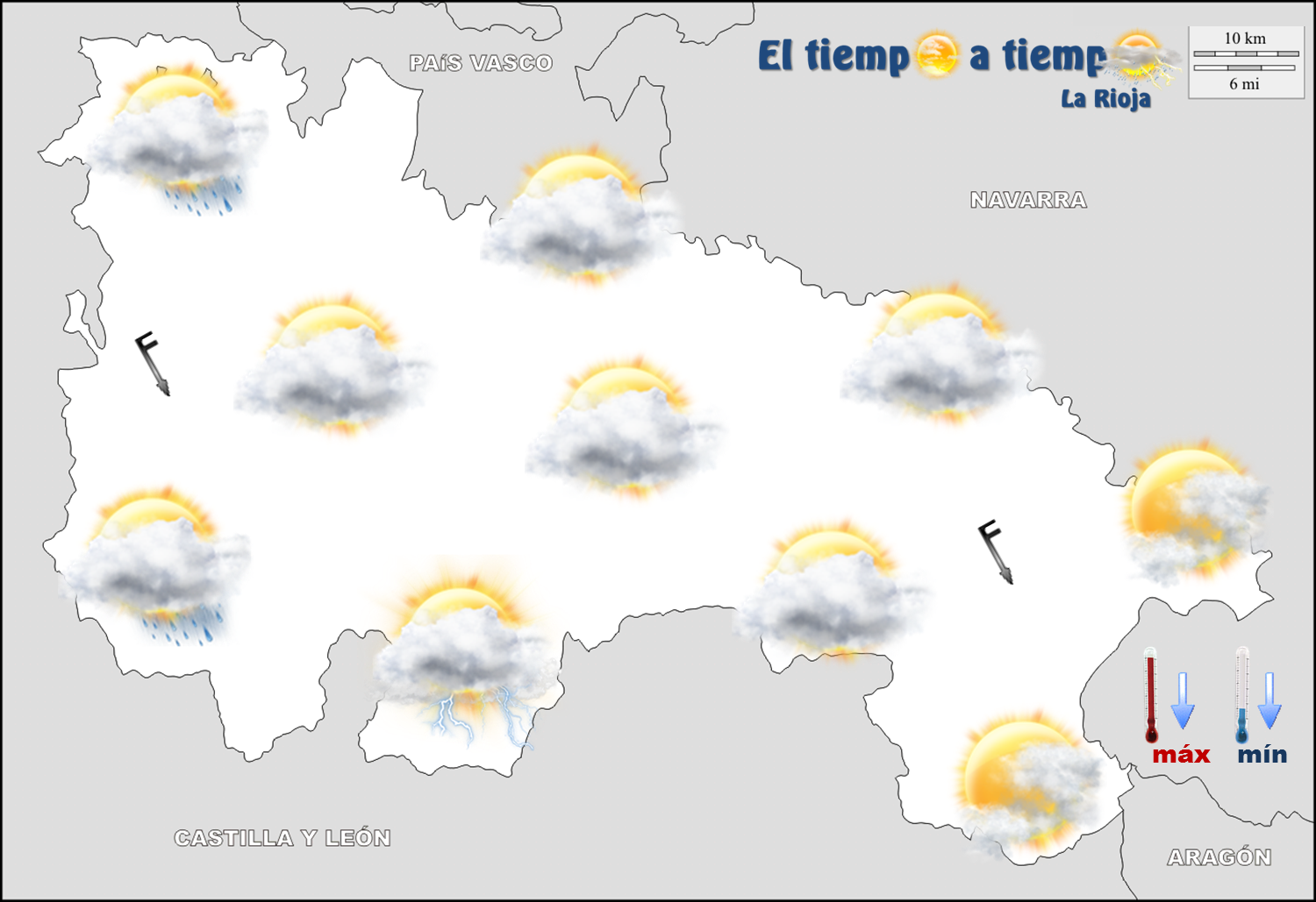 Intervalos de nubes bajas a primeras horas, sobre todo en la mitad occidental. En el resto algunas nubes medias y altas. El cierzo seguirá flojo a moderado, siendo más evidente en la rioja baja. Las temperaturas sin cambios, con máximas de 26-27ºC y mínimas de 12-13ºC.