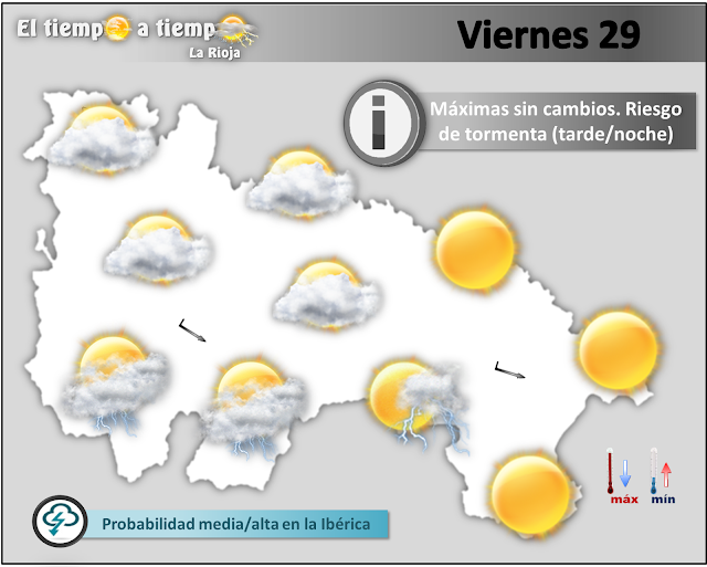Dia parecido, con mañana más tranquila y tarde con algunas tormentas en la Ibérica que de manera local podrían afectar a otras zonas del valle. Temperaturas sin cambios o algo más altas, máximas de 24/26ºC y mínimas de 10/12ºC. Cierzo flojo.