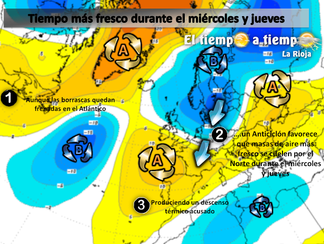 Aún con estas variaciones se espera que climáticamente sea un semana más cálida de lo normal en gran parte de la peninsula. En el caso de La Rioja, aunque con anomalías positivas más leves, estadísticamente también estará por encima de la media:
