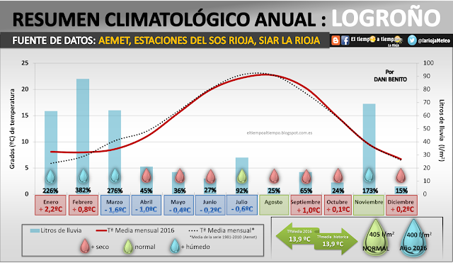 ¿Será una tendencia mantenida? ¿Iremos hacia inviernos más suaves y primaveras más frías? ¿Otoños anormales? El caso es que con todo....climáticamente el año 2016 se mantuvo en valores térmicos y pluviometricos normales...pero muy mal repartidos....